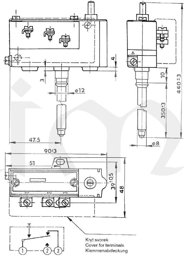 Termostaty se skládají ze dvou hlavních částí: teplot­ního čidla a spínací hlavice. Dilatační změny čidla se přenášejí prostřednictvím páky na spínač. Termostaty se vyrábí v provedení rozpínacím (2 svorky) nebo přepínacím (3 svorky). Svorky jsou šroubové s mož­ností připojení vodičů s max. průřezem 4 mm. K ochranné svorce musí být připojen ochranný vodič. Standardní provedení je opatřeno krytem svorek pro zabránění náhodného dotyku. Požadavek na provedení bez krytu svorek musí být uveden v objednáv­ce.