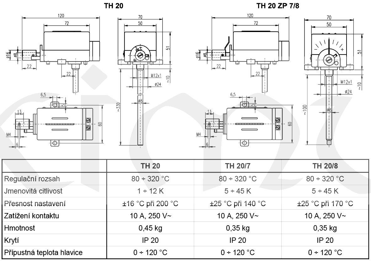 Termostat TH20 je jednopólový samočinný spínač, zalo­žený na principu nestejné tepelné dilatace dvou růz­ných kovů. Je určen k regulaci teplot plynného pro­středí, vytápěného střídavým elektrickým proudem (elektrické pečicí trouby a podobná zařízení) v daném rozsahu. Spínací hlavice může být umístěna v pro­středí s maximální teplotou okolí +120 °C a relativní vlhkostí vzduchu maximálně 80 %. Základem termo­statu je spolehlivý mechanický systém, který nemá žádnou vlastní spotřebu energie. Termostat se vyzna­čuje vysokou odolností proti mechanickému poškození a nízkými náklady na provoz a údržbu.