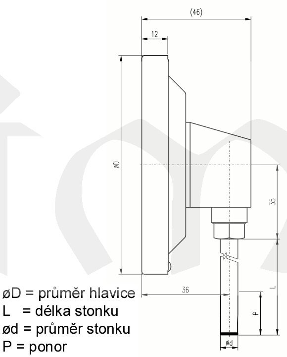 Teploměr se skládá z hlavice a stonku vyrobených z ušlechtilé oceli tř.17. Pro méně náročné aplikace je stonek od délky 630mm zhotoven z nelegované oceli s povrchovou úpravou Zn. V hlavici je upevněn ukazatel s číselníkem a stonek, v němž je upevněn měřicí systém. Tento systém je zhotoven z dvojkovu ve tvaru válcové spirály, která se působením tepla otáčí kolem své osy. Pohyb je přenášen na ukazatel, který vykazuje určitou výchylku udávající teplotu na stupnici. Aby údaje teploměru byly správné, je nutno při zabudování zajistit, že celý měřicí systém bude ponořen v měřené teplotě. Doporučená hloubka ponoru P je alespoň 60mm, pro rozsah 0-350°C minimálně 80mm. Teploměry s rozsahem 0 až 350°C a 0 až 450°C se nesmějí používat bez jímky.