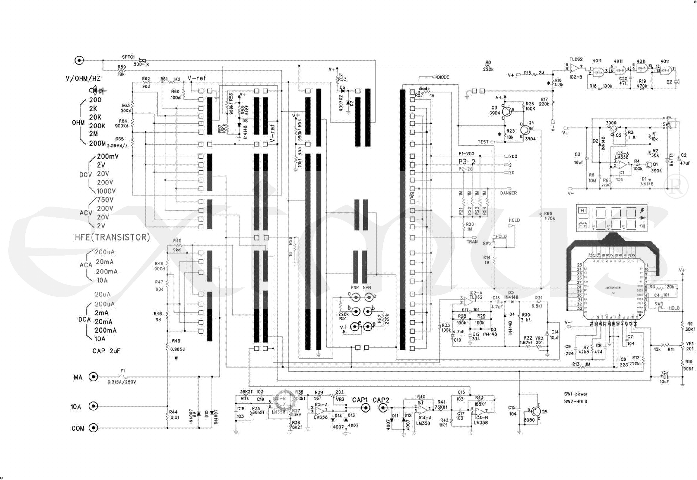 AC proud: 200µA / 20mA / 200mA / 10A