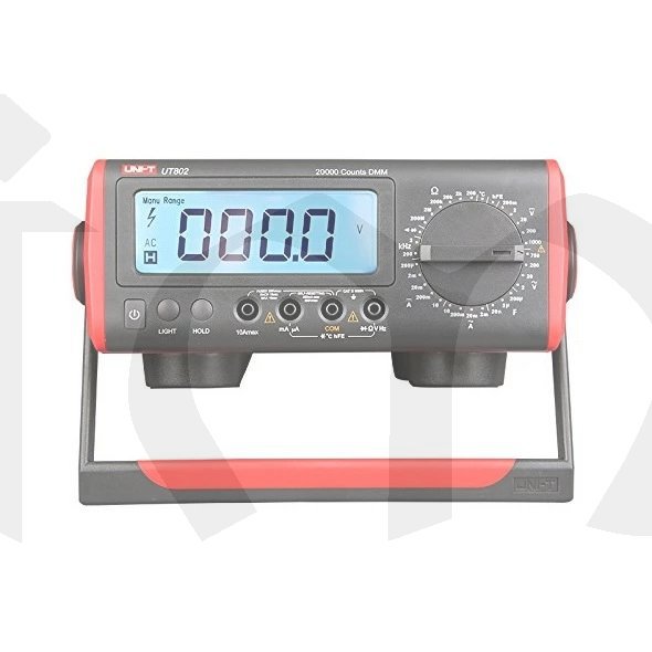 Stolní multimetr UT-802 je víceúčelový elektronický měřicí přístroj. Splňuje s vysokou přesností a pohodlností obsluhy potřeby měření elektrických parametrů při údržbě elektronických zařízení. Výhodou je mnoho funkcí a možnost použití i mimo dosah napájecího napětí 230V, protože umožňuje také práci na baterie. Přístroj má podsvětlený LCD displej se zobrazitelnou hodnotou ±19999. Přístroj je vyroben dle standardů IEC61010-1 a vyhovuje kategorii CAT II 1000V.