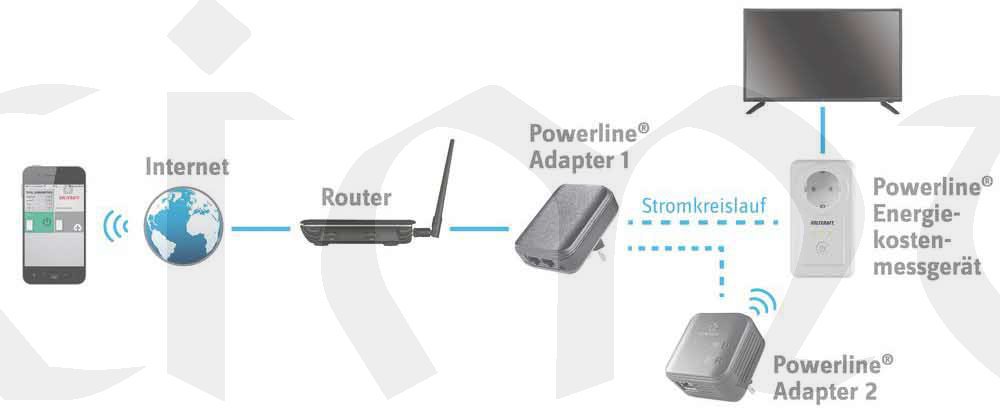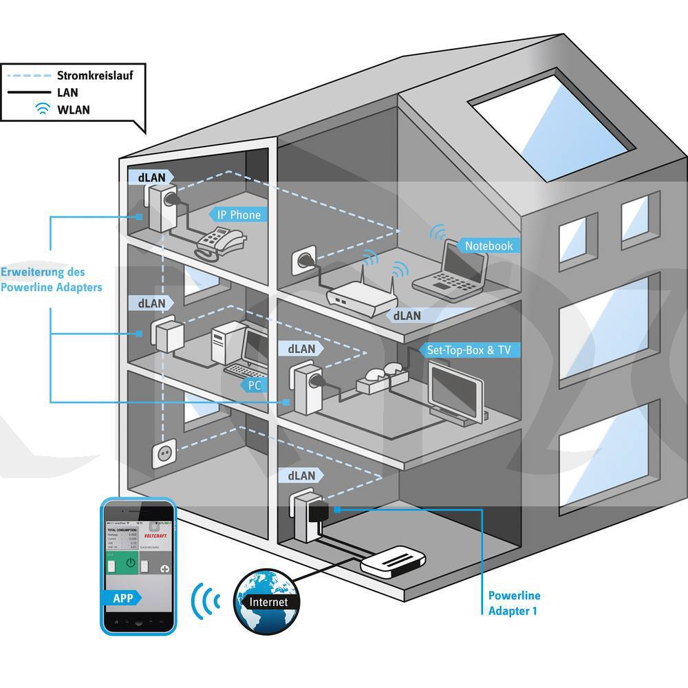 Měřič nákladů na energii se zapojí mezi zásuvku a elektrický přístroj a následně vytvoří propojení se stávajícím zařízením Powerline® Home Plug, které je spojeno s routerem. Díky tomu lze pomocí mobilního zařízení odkudkoli získat přístup k aktuálním údajům o spotřebě a také zapínat a vypínat připojené spotřebiče. Dále můžete nastavit časovač (programový / s odpočítáváním / náhodné spínání).