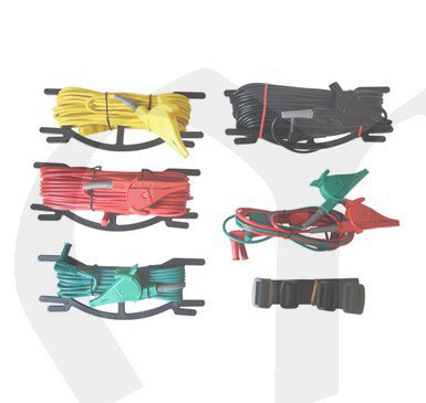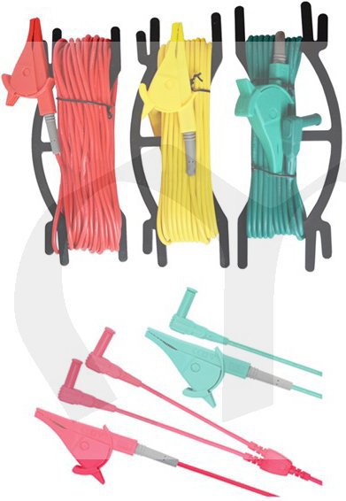 testovací kabely s krokosvorkami (s dvojitou zástrčkou 1x, s jednoduchou zástrčkou 1x), testovací kabely s krokosvorkami ( 40m červený, 20m červený, 10m žlutý, 5m zelený), zemní sondy 2x, pouzdro, kufřík, návod