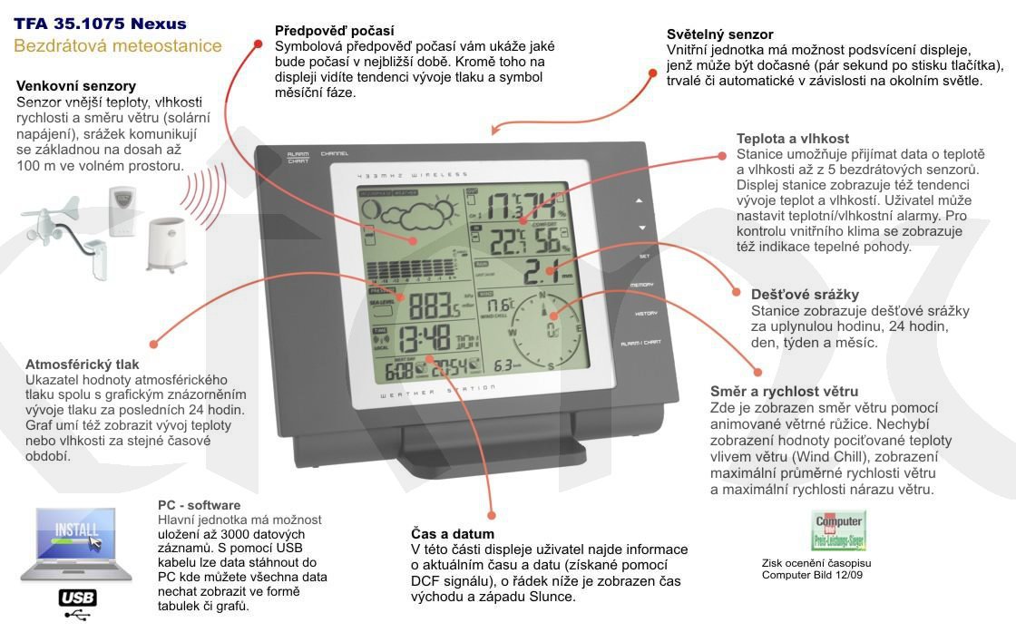 Výčet všech funkcí je opravdu dlouhý, a tak na začátek uvedeme jen ty fakta, která odlišují meteostanici TFA 35.1075 NEXUS od ostatních. Celoplošně podsvícený displej reagující na intenzitu denního osvětlení, bezdrátový přenos vnější ze všech vnějších čidel - teploty a vlhkosti, srážkoměru a anemometru až na 100 m, větroměr je vybavený solárním napájením a externí anténou..