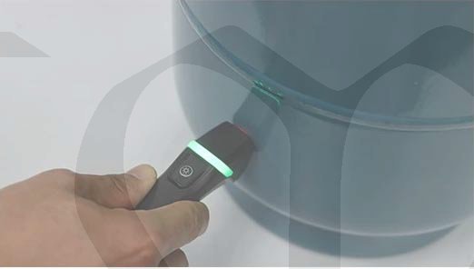 1. Přitiskněte ultrazvukovou sondu vodorovně na plynovou láhev. Ozve se bzučák a červená a zelená kontrolka budou stále blikat, což znamená, že probíhá měření.