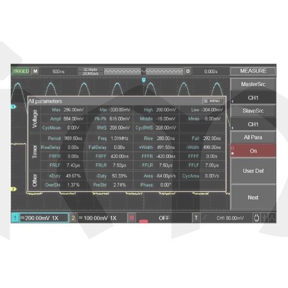 - automatické měření parametrů signálu: Max, Min, High, Low, Middle, Pk-Pk, Ample, Mean, Cycle Mean, RMS, Cycle RMS, Area, Cycle Area, OverShoot, PreShoot, Period, Freq, Rise, Fall, +Width, -Width, +Duty, -Duty, RiseDelay, FallDelay, Phase, FRFR, FRFF, FFFR, FFFF, FRLF, FRLR, FFLR, FFLF