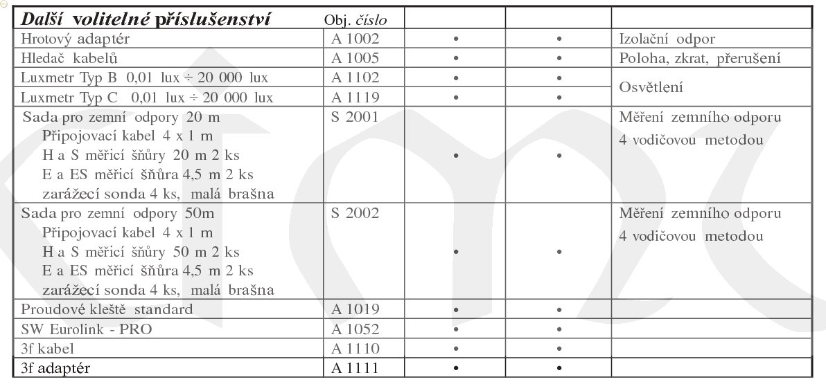 měření izolačního odporu, přechodových odporů a spojitosti, impedance ochranné smyčky, zkratového proudu, impedance smyčky, sledu fází, vyhledávání závad na instalacích, výkonu, účiníku, energie, proudu TRMS, harmonických složek napětí a proudu, napětí a kmitočtu sítě, vypínacího času proudových chráničů, dotykového napětí, odporu uzemnění a měrného odporu půdy, varistorů napěťových ochran..