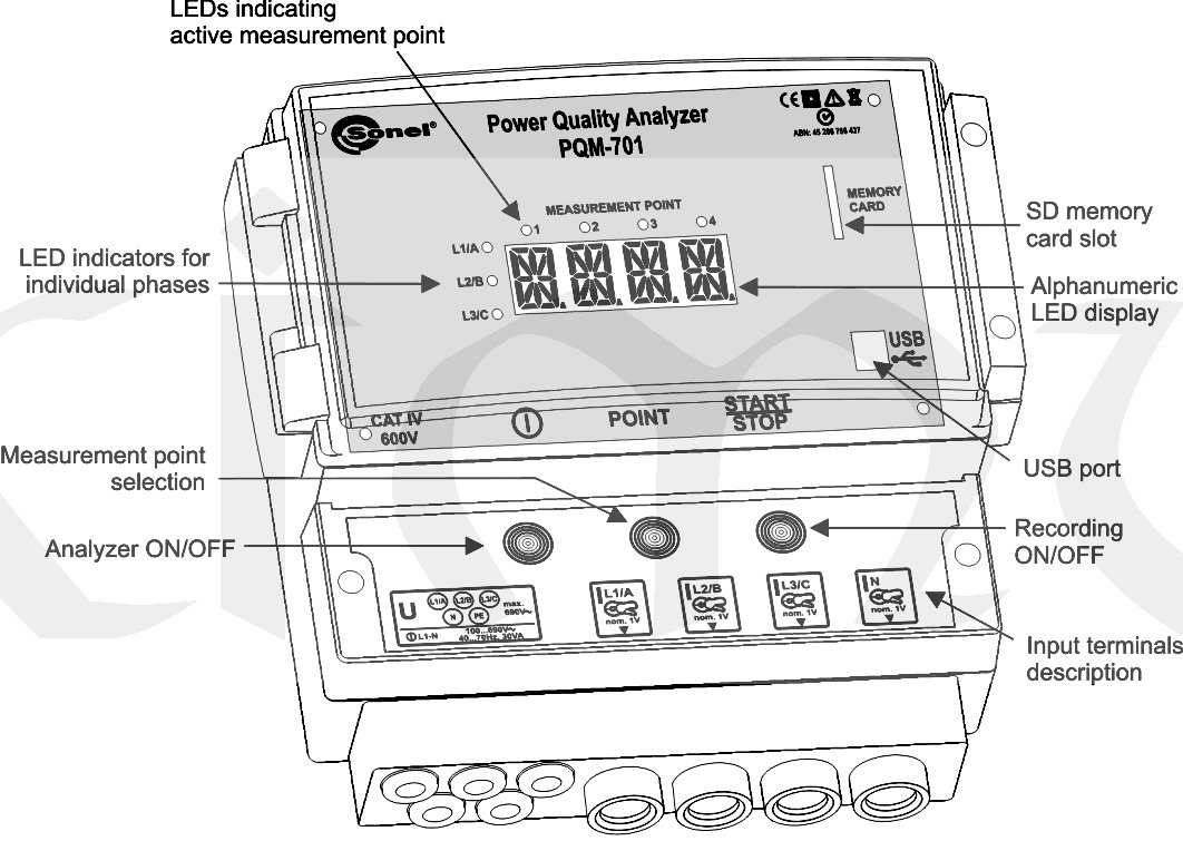 • L1, L2, L3, N-PE napětí (pět měřených vstupů, splňuje požadavky EN 61000-4-30 třídy A) - střední, minimální a maximální hodnoty, okamžité hodnoty v rozsahu do 690 V, schopnost kooperace s napětím transformátorů.