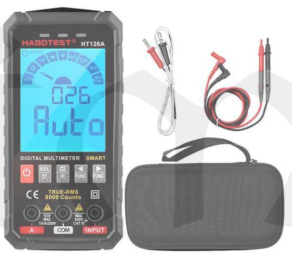 HT-126A je chytrý a odolný multimetr od společnosti Habotest. Vyznačuje se přesností měření, můžete jej používat i ve venkovním prostředí. Je vybaven velkým displejem a silikonovými tlačítky - jeho používání je jednoduché a pohodlné. Je kompaktní a lehký - má také LED svítilnu, která vám umožní pracovat i na tmavých místech. K napájení potřebuje 4 baterie AAA 1,5V. Ty však nejsou součástí balení a je nutné je zakoupit zvlášť. Můžete jej použít k měření napětí, odporu, kapacity atd.