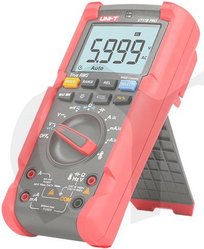 Tyto měřicí přístroje jsou dodávány s pozlacenými měřicími kabely pro rychlé a přesné měření. Multimetr UT17B PRO poskytuje ochranu v celém rozsahu do 1000 V, stejně jako ochranu proti přepěťovým špičkám napětí 8 kV, aby mohl odolat náhlým rázům vysokého napětí. Rozsahy mohou být přepínané automaticky nebo manuálně. Můžete využít automatického podsvícení displeje LCD, jehož maximální zobrazitelná hodnota je 6200. Měřicí přístroj UT17B PRO umožňuje také měření kmitočtu, pracovního cyklu a teploty. Možnost používání i v prostředí s elektrickým polem až 1V/m. Proudový rozsah μA a mA je jištěn rychlou pojistkou FF440 mA H 1000 V, ø10 x 38mm CE a proudový rozsah 10A je jištěn rychlou pojistkou FF11A / 1000V ø10 x 38mm CE. Napájení je provedeno dvěma kusy tužkových baterií AA R6 1,5V a přístroj se automaticky vypíná po 15ti minutách nečinnosti (funkci lze dočasně vypnout).