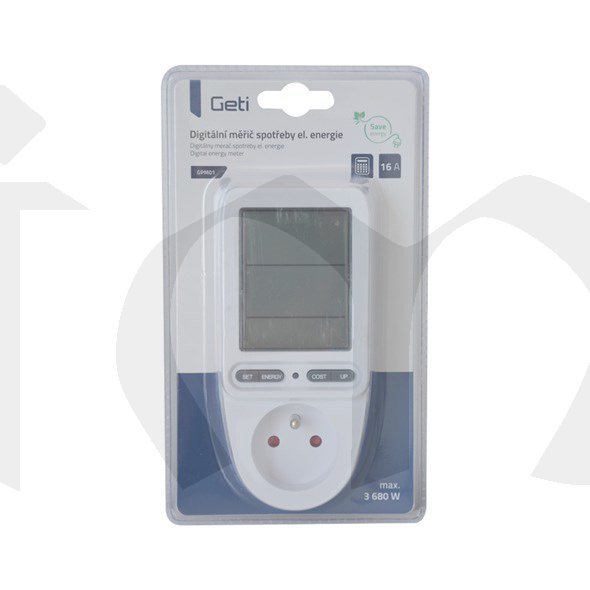 Měřič Geti GPM 01 s rozšířeným designem slouží k měření spotřeby elektrické energie různých domácích spotřebičů, dokáže vypočítat odpovídající finanční náklady, kalkulovat emise CO2 za spotřebovanou energii, a poskytuje souhrnné informace o spotřebě i v dlouhodobém časovém rozpětí, včetně počítání celkové doby měření. Tyto informace Vám mohou přispět ke snížení nákladů za elektrickou energii. Ačkoliv měřič obsahuje celou řadu nastavitelných funkcí a zobrazitelných informací, jeho ovládání je snadné a displej je velmi přehledný.