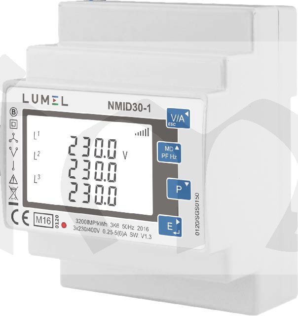 Elektroměr NMID30-1 je moderní zařízení určené ke sledování základních elektrických parametrů. Byl navržen pro 1fázové a 3fázové sítě a vybaven impulzním výstupem a digitální linkou RS-485 pro dálkové monitorování měřených parametrů nebo systémů BMS. Podsvícený displej umožňuje zobrazit až 16 různých měřených hodnot. Displej lze konfigurovat pomocí tlačítek. Jednou z výhod je schopnost naprogramovat korekci indikace výkonu v důsledku nesprávného připojení nebo instalace proudových transformátorů Shoda se směrnicí MID (moduly B + D)