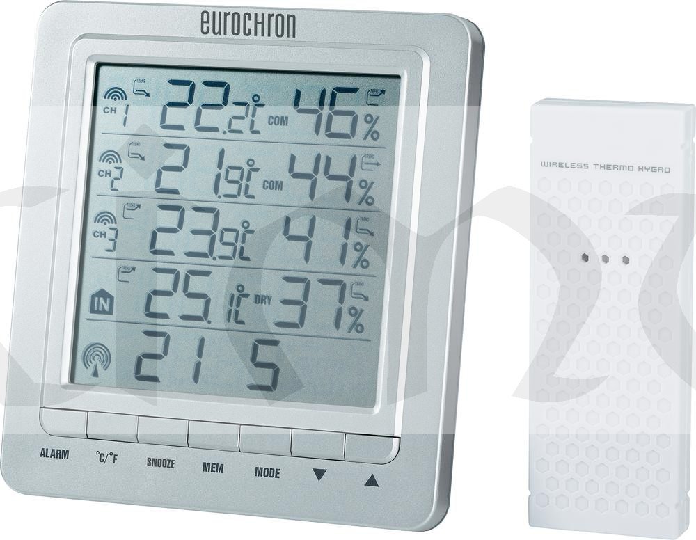 Díky tomu lze pohodlně monitorovat teplotu a vlhkost na čtyřech různých místech. Všechny naměřené hodnoty jsou zobrazeny na jednom přehledném LCD displeji. Zobrazení úrovně komfortu dle naměřené vlhkosti. Záznam pro min/max hodnoty jednotlivých prostorů. Stanice navíc vybavena hodinami s budíkem a datem.